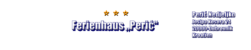 Ferienhaus "Peric" Peric Nedjeljko Josipa Kosora 24, 20000 Dubrovnik Tel.: 00385 (0)98 34 42 04 GPS- Position: 42°38’49,00” N 18°4’56,58” E E-Mail: nedjeljko.peric@du.t-com.hr